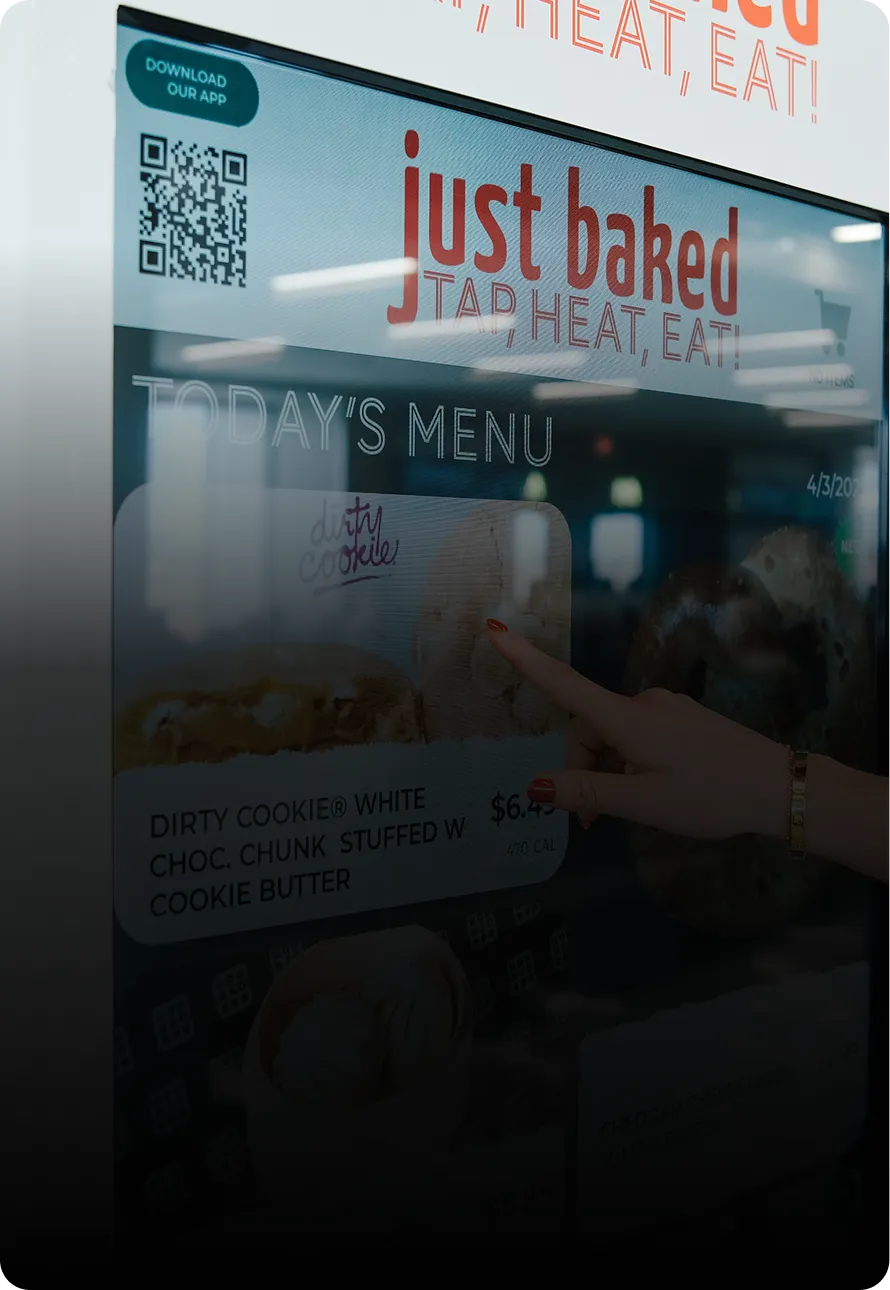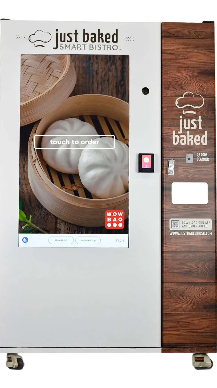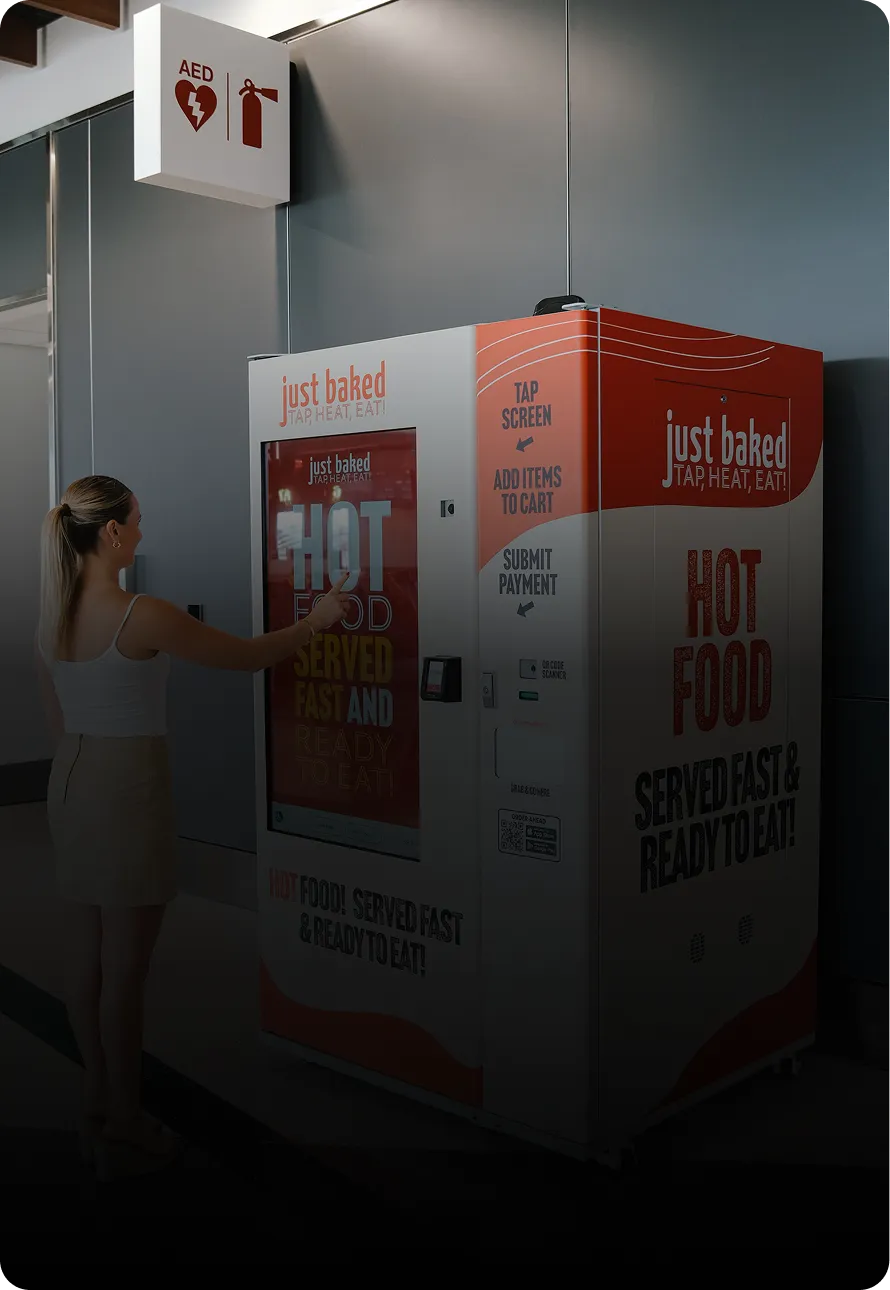 Our Just Baked™ kiosk makes hot meals possible in seconds instead of waiting 30+ minutes for marked-up delivery. Now, people in places like hospitals and colleges can get their favorite foods instantly, 24/7.